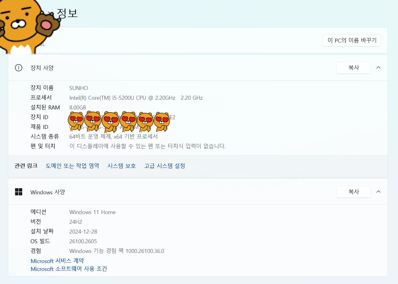 i5-5200U 시피유에 8G 램으로 윈도우11이 잘 설치가 되었다.